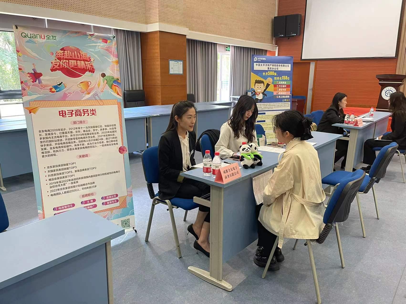 本次招聘会邀请四川天府银行股份有限公司、中国太平洋财产保险股份有限公司重庆分公司、中国太平洋财产保险股份有限公司四川分公司、北京思特奇信息技术股份有限公司、成都全友电子商务有限公司、上海如钒企业管理咨询公司、四川创智投资咨询有限公司、成都虞美人女神美容服务有限公司共8家用人单位来校招聘。招聘会始前,学院领导、系主任与用人单位就人才培养和企业需求开展调研座谈,征集用人单位有关课程设置和学生能力提升的建议,积极拓展学生实习实践、校外导师等校企合作新空间。招聘会现场气氛热烈,本次参会单位均设有与学院专业相匹配的岗位需求,学院2023届毕业生踊跃到场投递简历,反响良好。