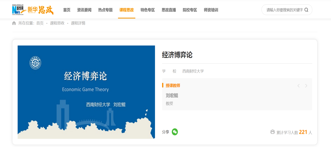教师刘宏鲲教授主讲的“经济博弈论”在“新华思政”(全国高校课程思政教学资源服务平台)上线,面向全社会开放共享。