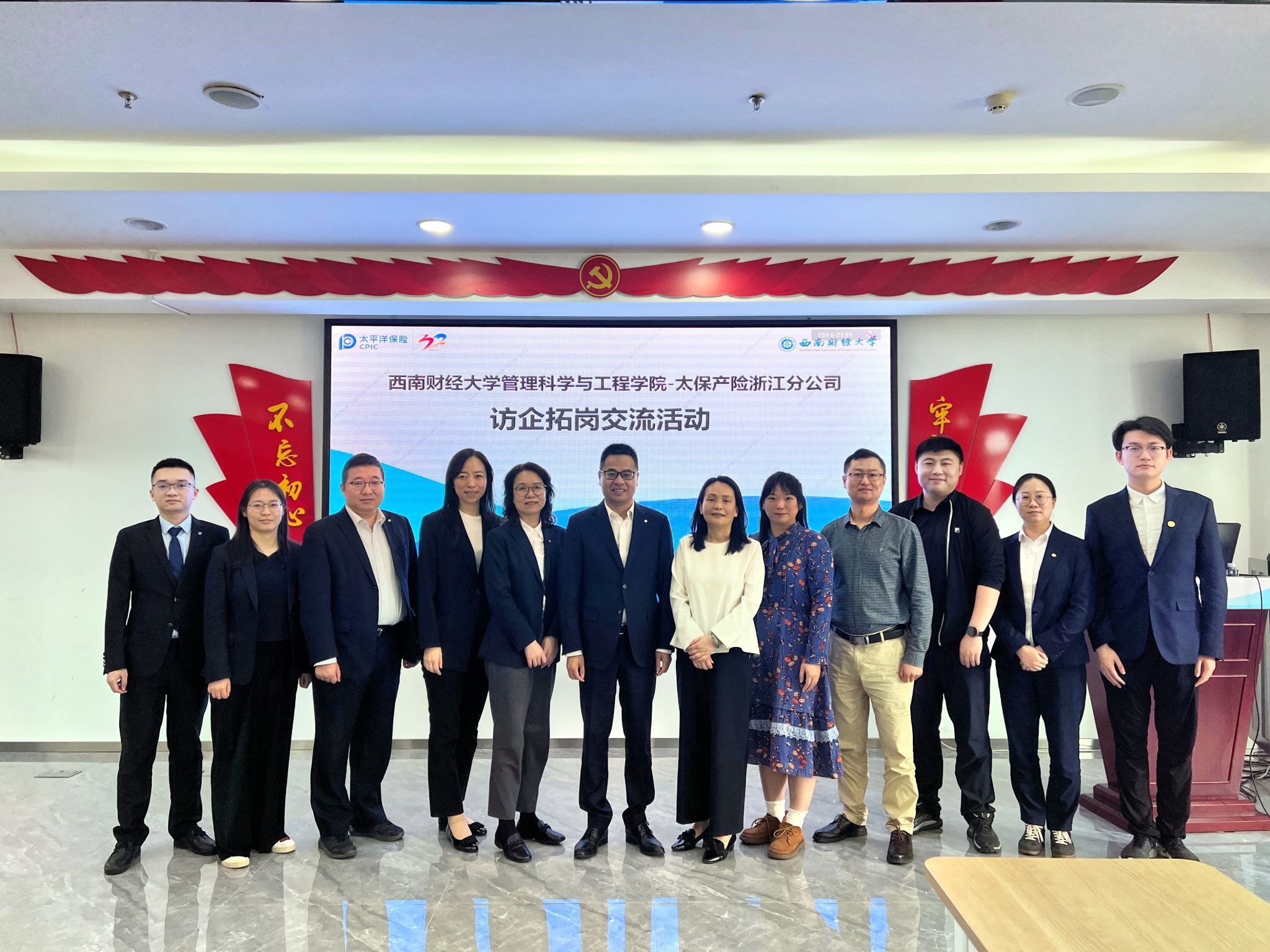 在中国太平洋财产保险股份有限公司浙江分公司,公司党委书记、总经理苏金华首先对我院调研组一行来杭访企拓岗促就业表示热烈欢迎,他介绍了公司近年来的发展现状,对西财毕业生在太平洋财险工作的成就表示充分肯定,希望与我院能够建立长效沟通机制,深化合作,互惠共赢。座谈会上,公司副总经理陈道晃介绍了保险企业在当前社会环境下所具有的就业优势和未来前景,公司部门领导周瑾、沈苑和张明对员工福利保障、企业数字化转型及信息化建设等方面分别做讲解,与会校友就人才培养方案修订、素质能力拓展方面提出意见建议。院企双方围绕人才培养、实习就业、产教融合等方面充分交流,公司表示,我院办学特色鲜明,发展目标明确,未来将扩大人才招聘的专业方向,吸纳来自不同专业的优秀人才。