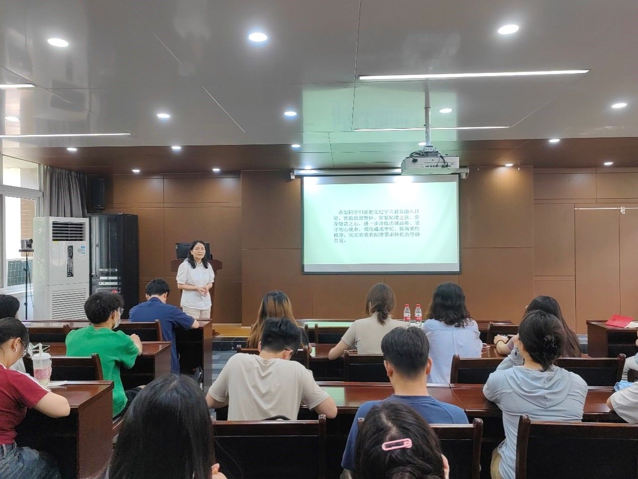 为深入推进党纪学习教育,引导全体学生党员认真学习《中国共产党纪律处分条例》,做到学纪、知纪、明纪、守纪,6月18日下午,学院党委书记周敏在通博楼D301会议室为毕业生党员作“党的纪律建设永远在路上”党纪学习教育专题党课,解读新修订的《中国共产党纪律处分条例》,学校特聘组织员刘伟林同志受邀莅临指导,学院40余名毕业生党员现场聆听。