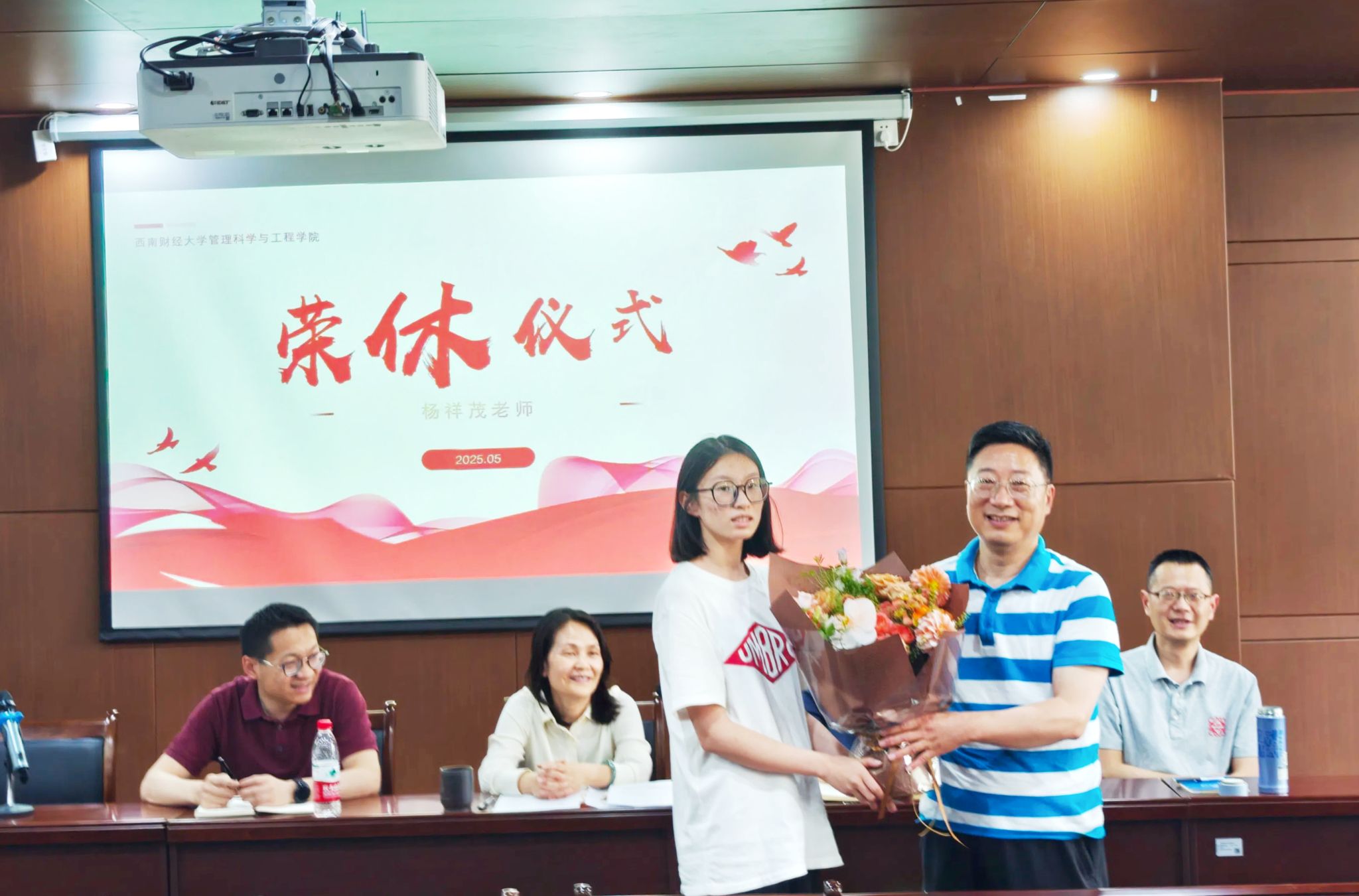 学生代表杨紫意表达对杨祥茂老师的感恩与不舍,讲述杨老师在课堂上总能用生动的案例把复杂理论讲解得通俗易懂,对学生成长和发展助益良多。发言结束后,杨紫意为杨祥茂老师献上了鲜花。