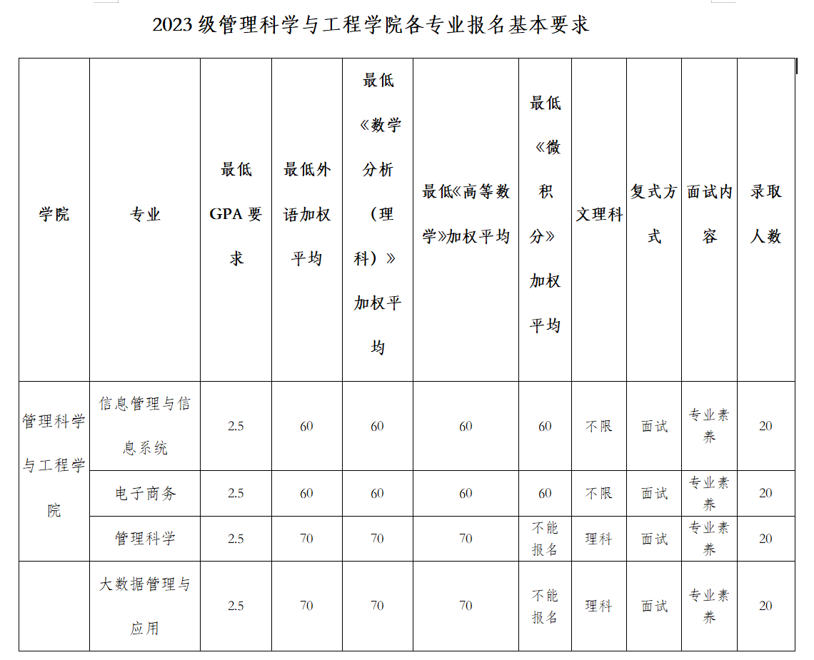 信息管理与信息系统 | 专业素养 | 1.在思政素质考查合格且复试成绩不低于60分(满分100分)的前提下,按照综合成绩排名录取 2.综合成绩=学业成绩加权平均成绩*0.6+复试成绩*0.4 |