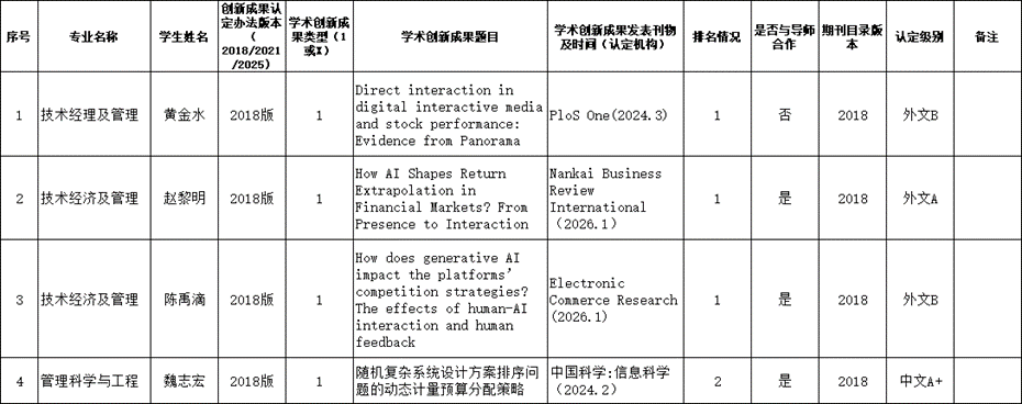 根据《五楼自拍 博士生申请学位学术创新成果认定办法》和我院相应专业的博士生培养方案要求及科研成果发表的相关规定,学院对相关博士生的学术创新成果及科研情况进行了审核,现将结果予以公示。公示期15日,即自2026年4月14日至4月28日,在此期间若有异议,请及时反馈学院。
